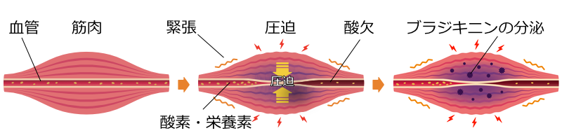 筋肉が緊張して血行不良が起きると、細胞が酸欠を起こしブラジキニンという痛みの原因物質が分泌されます